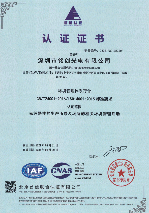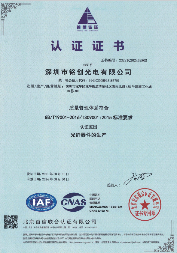 深圳市銘創(chuàng)光電有限公司于2012年成立,公司總部位于深圳市光明區(qū),是一家國家級(jí)高新技術(shù)企業(yè),通過了IS09001-2015質(zhì)量管理體系認(rèn)證和IS014001-2015環(huán)境管理體系認(rèn)證;經(jīng)過多年的持續(xù)研發(fā)投入和專注發(fā)展,銘創(chuàng)光電已逐漸成為光纖激光器、光纖傳感、激光雷達(dá)和激光通信等領(lǐng)域的綜合性產(chǎn)品服務(wù)商。 公司目前設(shè)立有光無源器件研發(fā)生產(chǎn)中心和激光研發(fā)生產(chǎn)中心。無源器件研發(fā)生產(chǎn)中心設(shè)有有高標(biāo)準(zhǔn)的無塵車間,可提供各種波長的無源光纖器件、高功率光纖器件、保偏光纖產(chǎn)品、超小型光纖器件。激光研發(fā)中心建立在安徽合肥市,研發(fā)生產(chǎn)特殊波長的激光光源、光纖激光器、光纖放大器以及新產(chǎn)品的技術(shù)研究儲(chǔ)備。研發(fā)生產(chǎn)中心與多地科研單位合作,能夠迅捷高效的為客戶提供相
